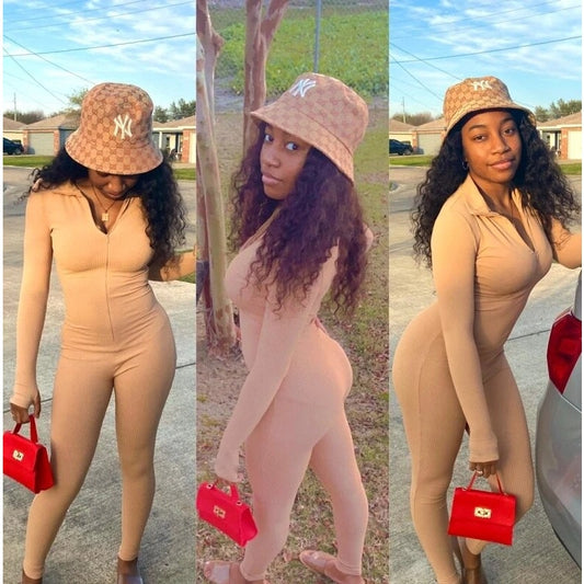 XS Beige Ribbed High Neck Long Sleeve Stretchy Jumpsuit