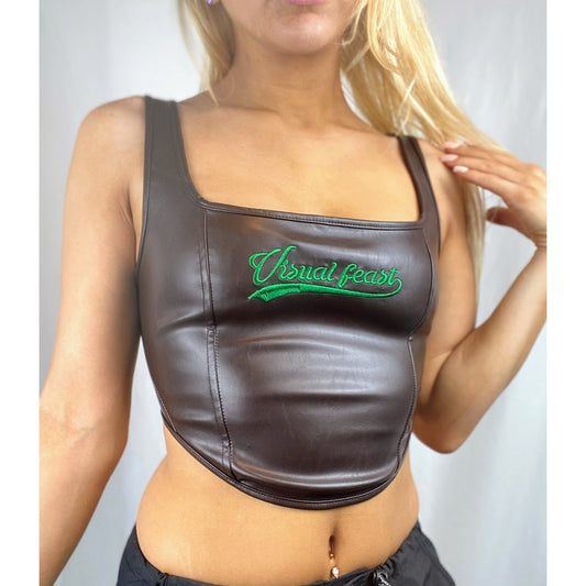 New Small Vegan Leather Brown Corset Bustier Top Sexy Cami Sleeveless Vintage