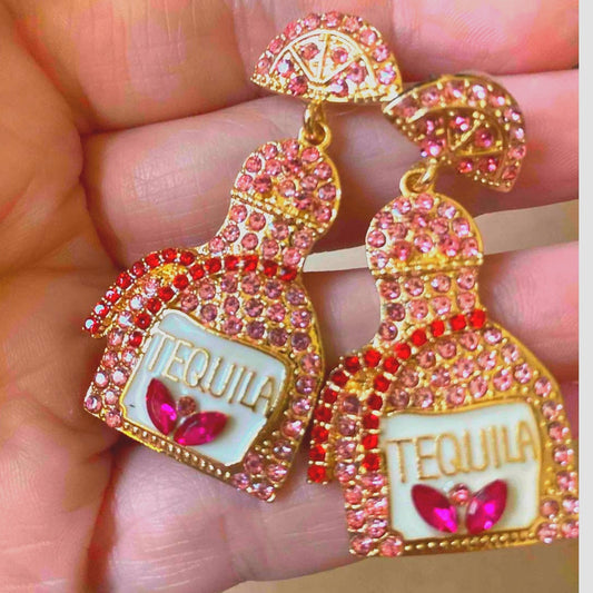 Pink Rhinestone Tequila Bottle Dangle Earrings