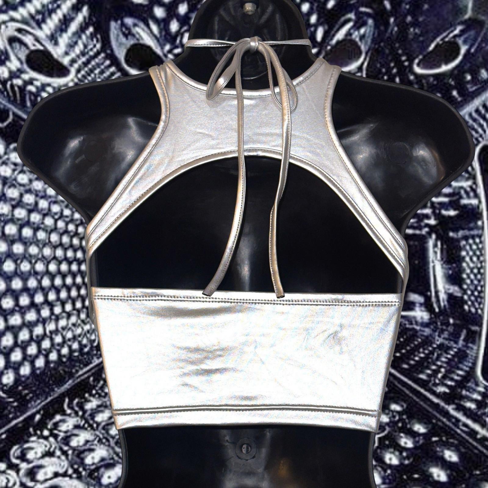 Futuristic silver halter crop top with layered strap detailing and a sleek metallic finish. Features a structured bust panel, cross-strap neckline, and an adjustable belt detail at the waist for a bold, armored silhouette. Perfect for rave, festival, or cyber-punk inspired outfits.