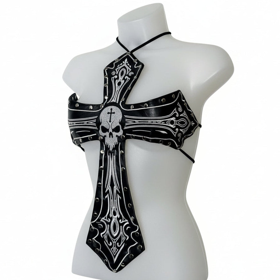 A cross reimagined through rebellion. The Saint Vandal Cross Top is made from 100% vegan materials and designed to contour the body with dramatic structure and metal detailing. Equal parts gothic and modern, it’s a statement piece built for styling after dark—or whenever subtle isn’t the goal.