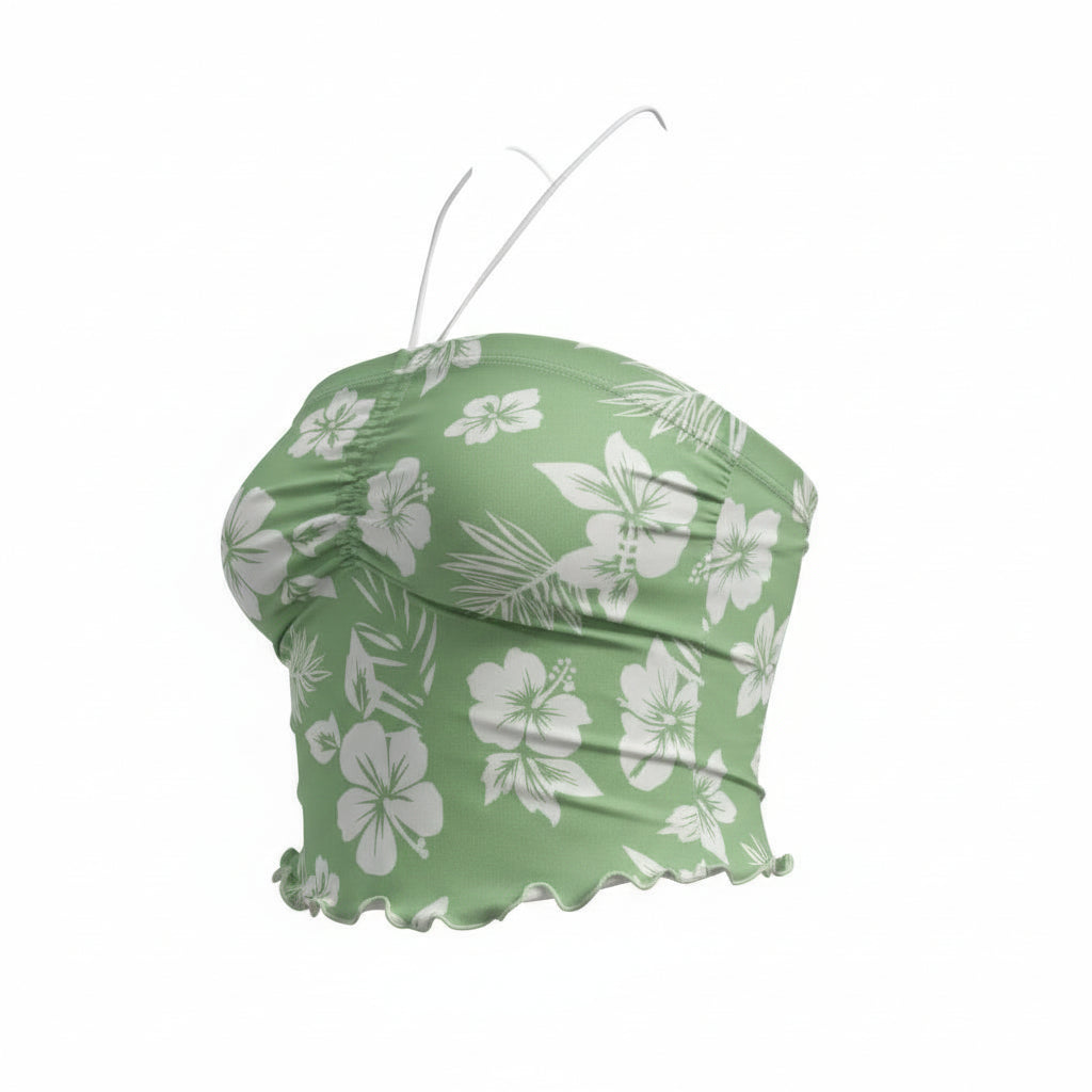Small Green Hibiscus Ruched Halter Neck Sweetheart Crop Top